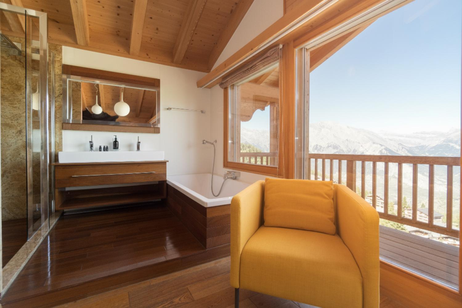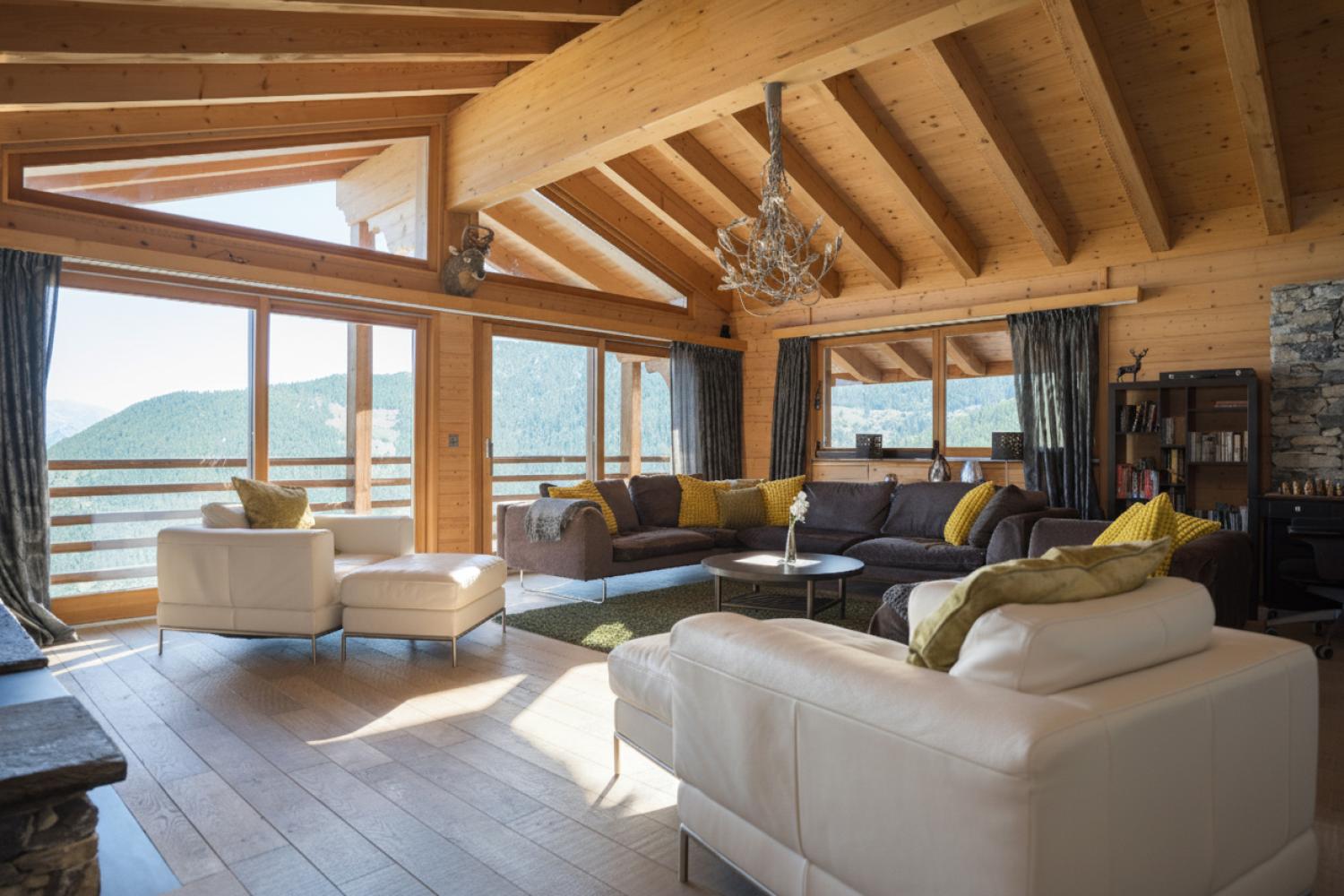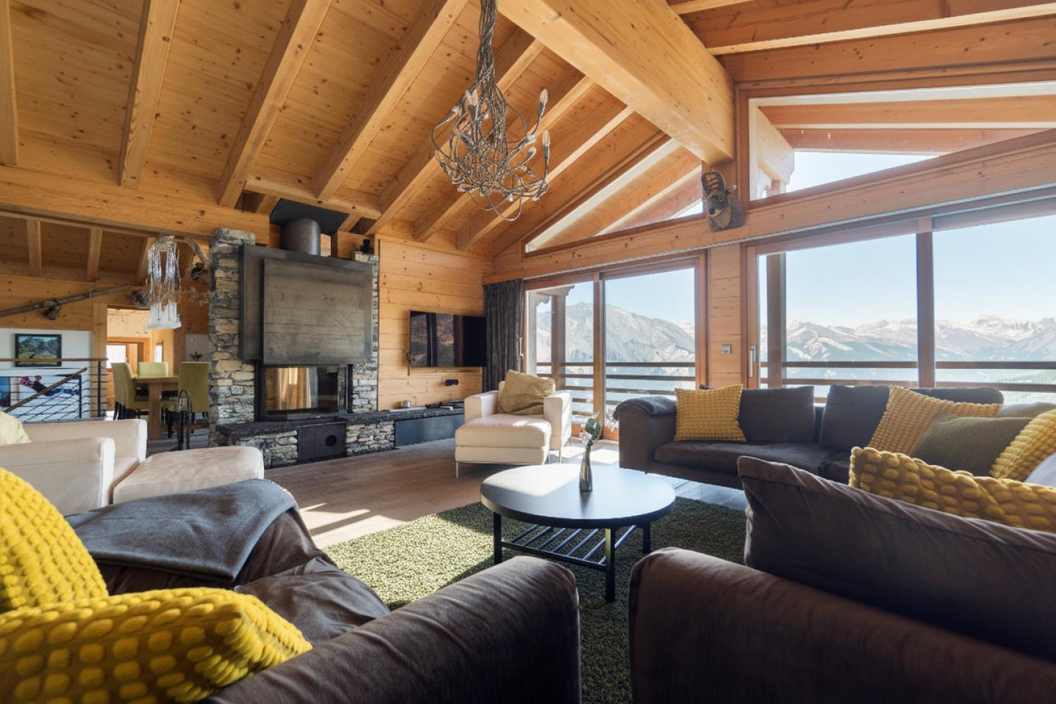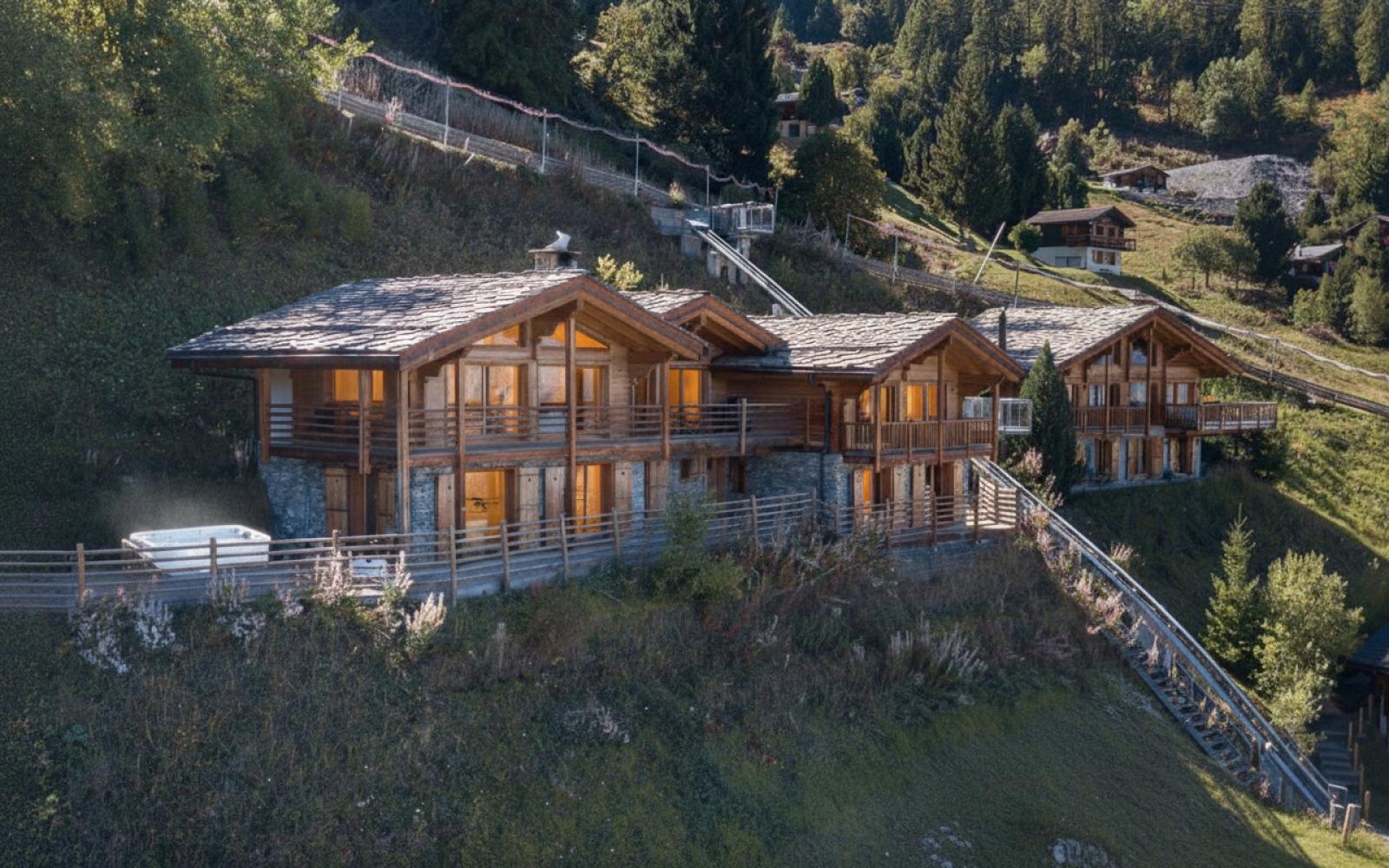 This stunning freestanding chalet offers breathtaking views over the Rhone valley and beyond in the heart of the 4 Valleys ski system. It is a uniquely spacious place both for families and groups. The chalet is spread over two floors perched on the side of the mountain. Access is directly from the piste by a small private funicular lift which will also deliver you from the road or garage to the front door.