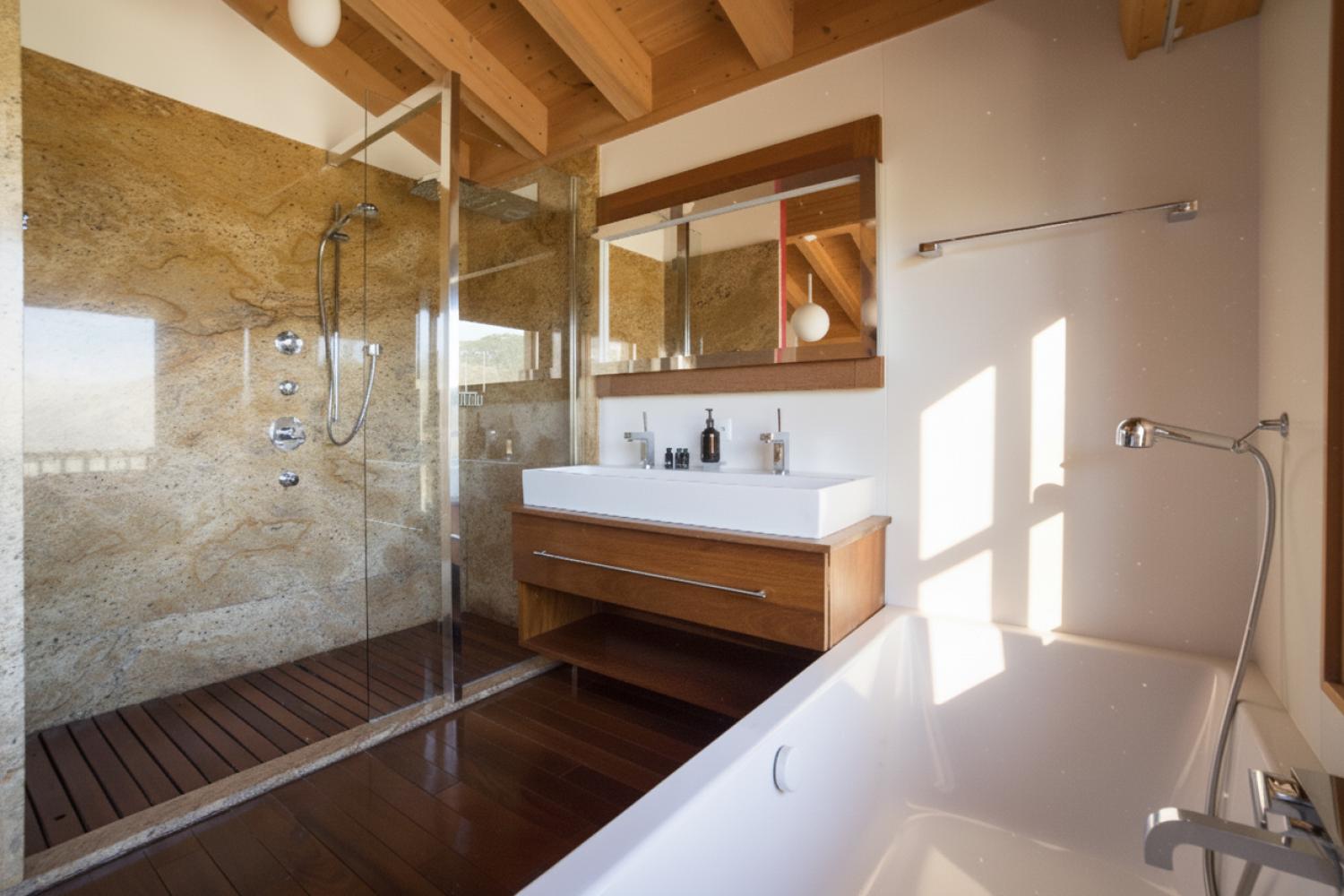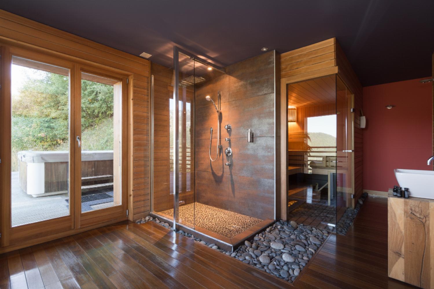 The secluded outdoor jacuzzi can seat 6 people with great views over the valley. It is located immediately adjacent to the relaxation spa room containing the novel Sanariumâ„¢ sauna system which allows for a combination of heat therapy from traditional sauna through tropical rain forest to steam room.