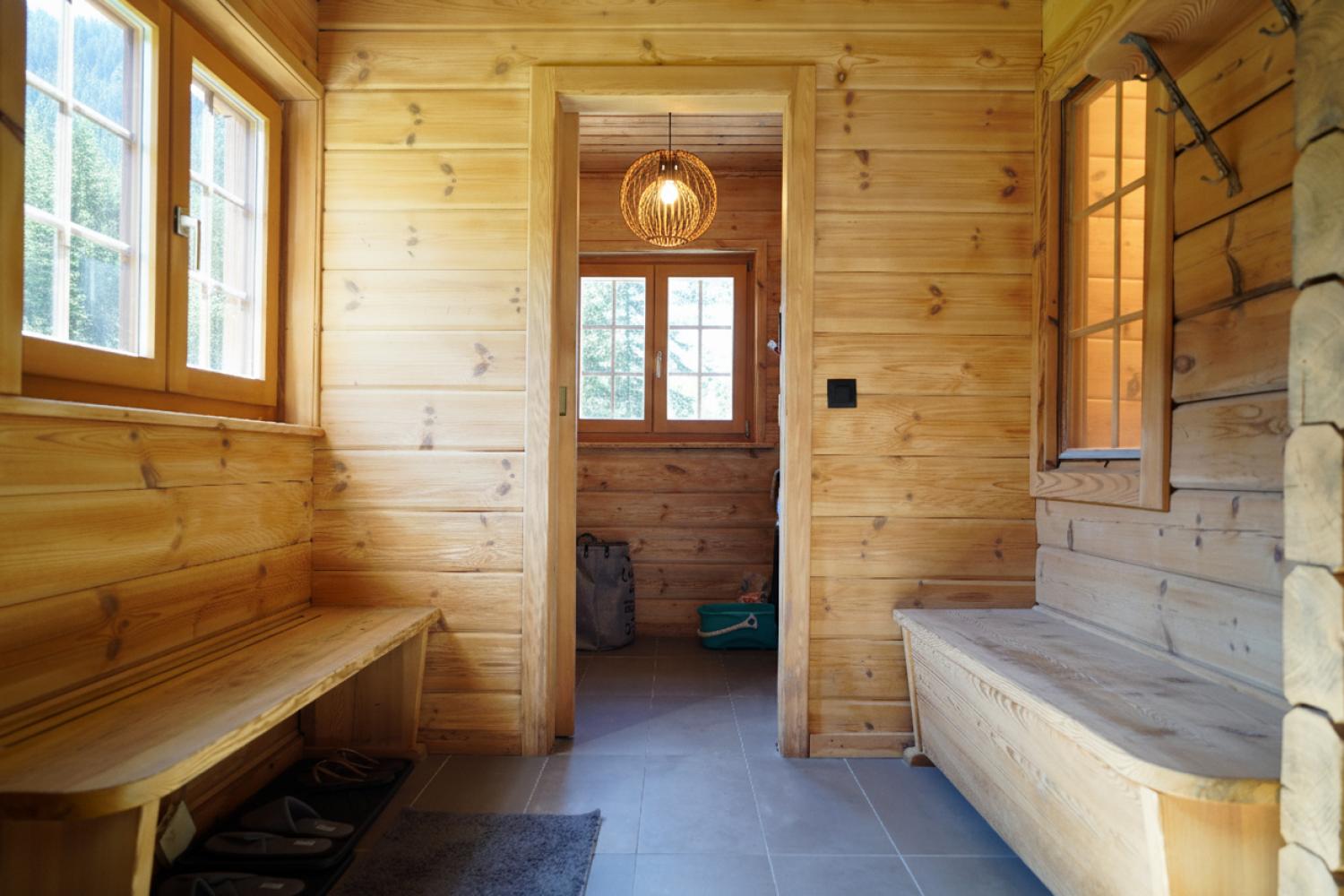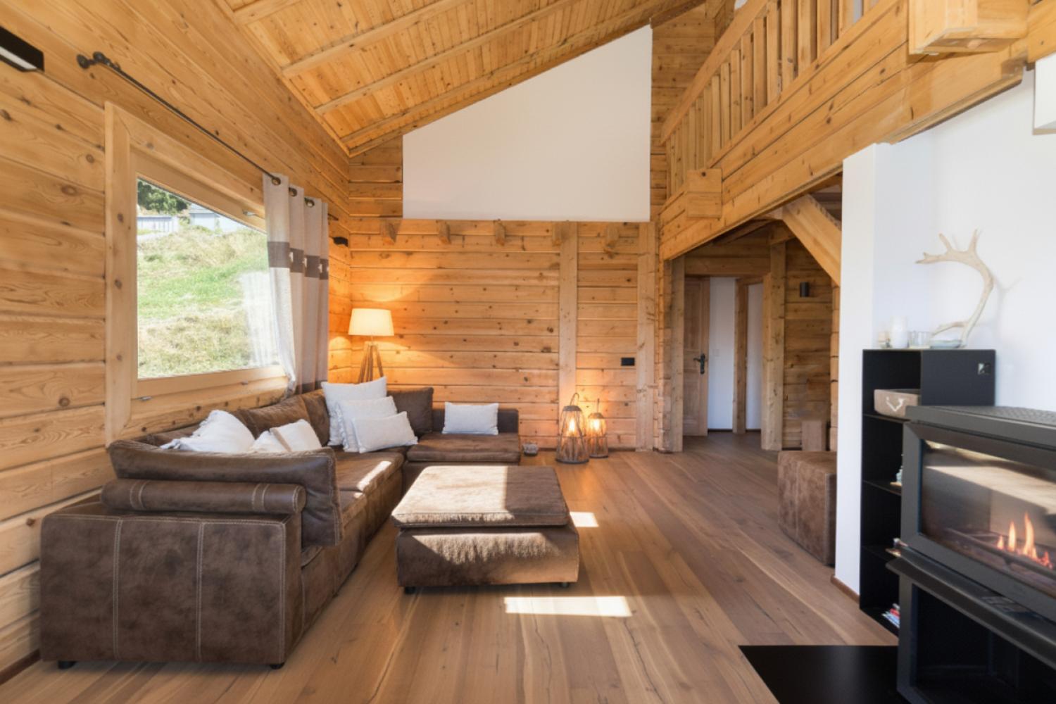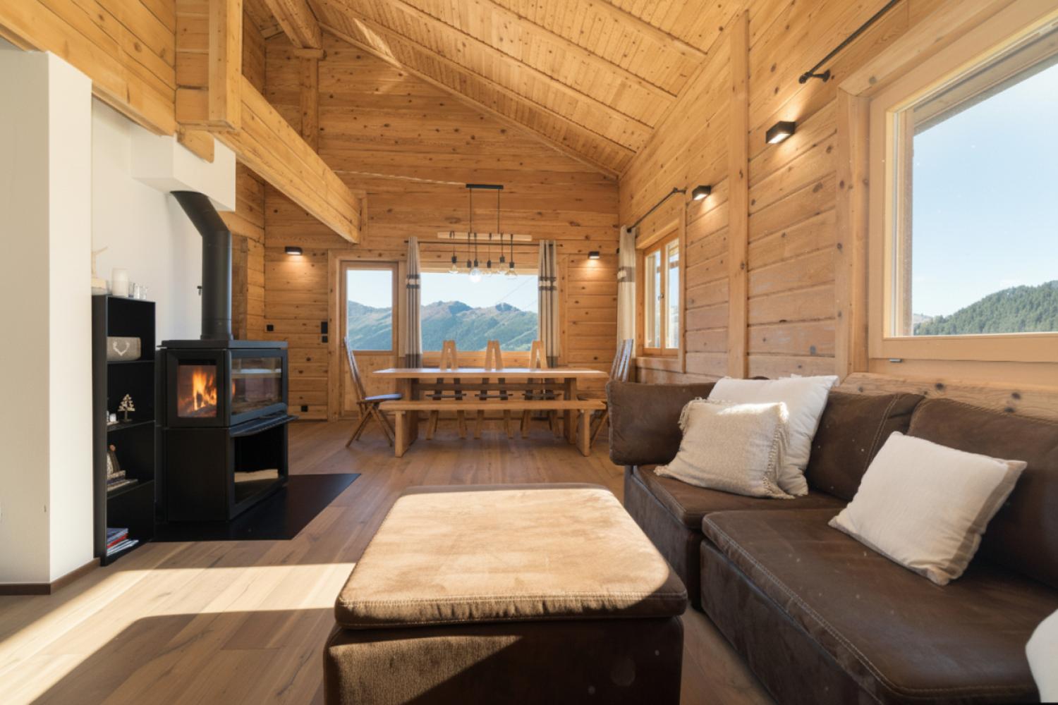 The heart of the chalet is the open-plan living and dining area, where a large sofa surrounds the central fireplace - perfect for après-ski relaxation. A dining table seats up to 12 guests, adjacent to a brand-new, fully equipped kitchen with a breakfast bar and modern appliances. Windows open onto a garden with breathtaking panoramic mountain views.