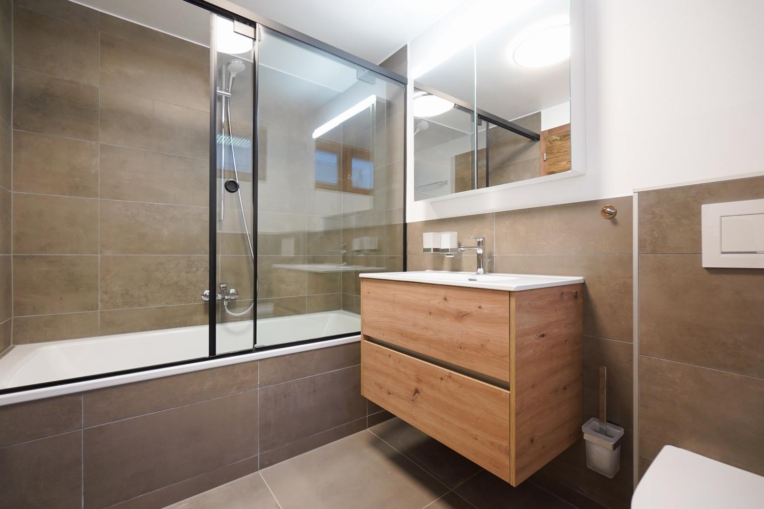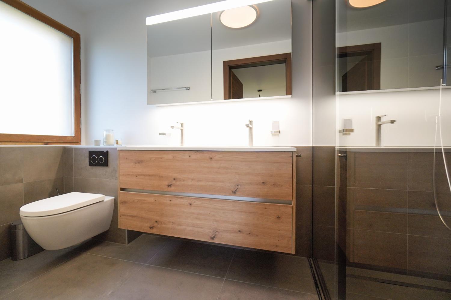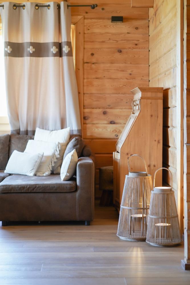 The heart of the chalet is the open-plan living and dining area, where a large sofa surrounds the central fireplace - perfect for après-ski relaxation. A dining table seats up to 12 guests, adjacent to a brand-new, fully equipped kitchen with a breakfast bar and modern appliances. Windows open onto a garden with breathtaking panoramic mountain views.