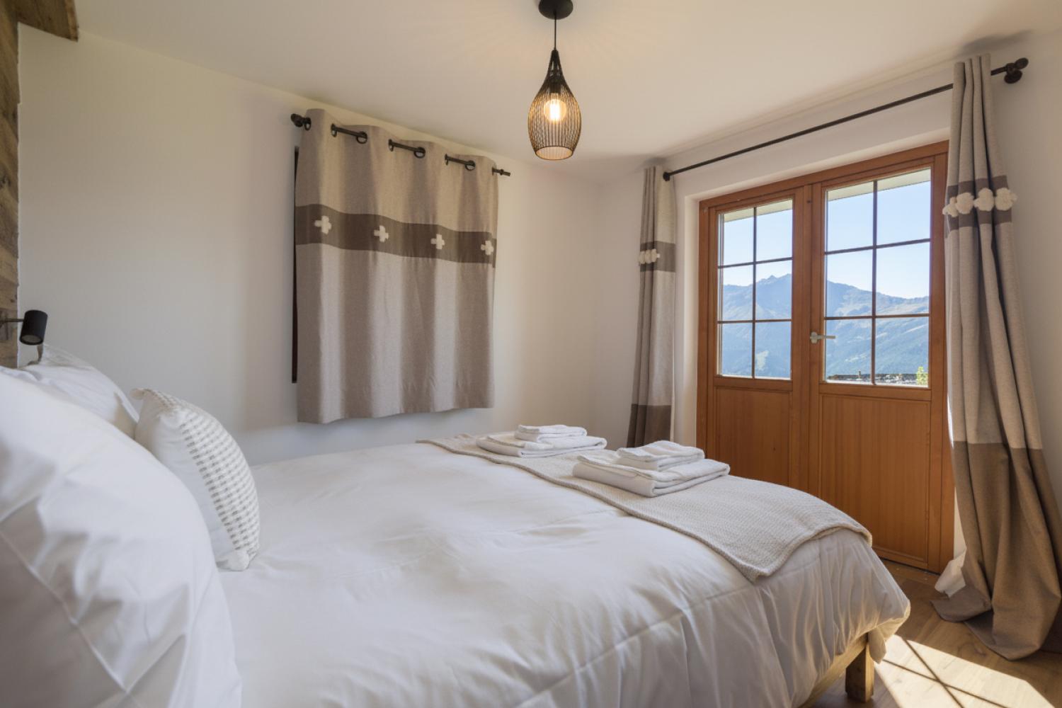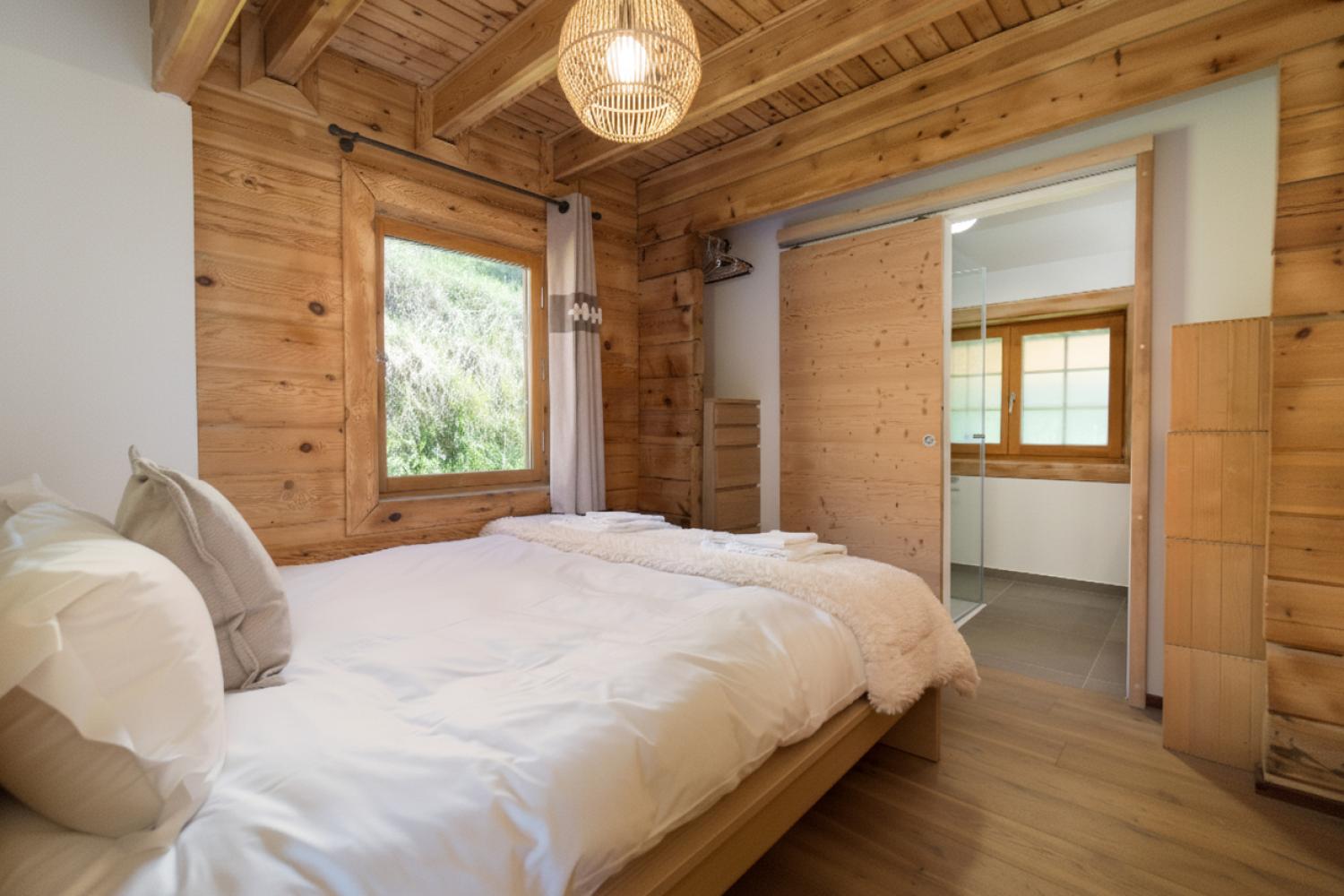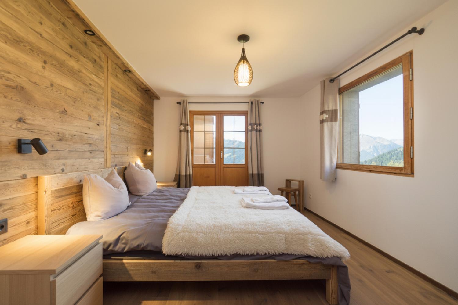 A luxurious master suite with a 180cm double bed, en-suite bathroom, and direct access to a private terrace with stunning alpine views.