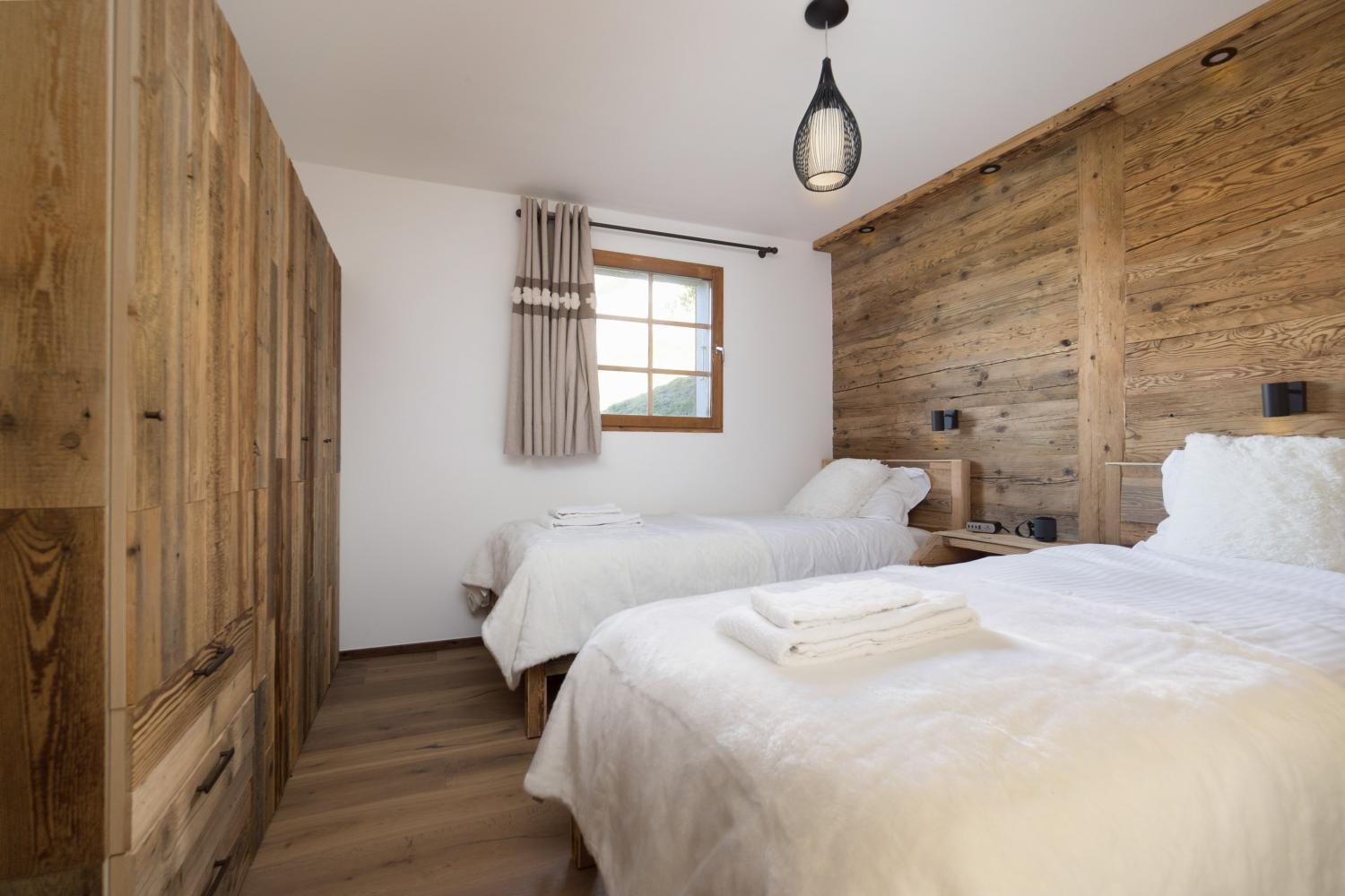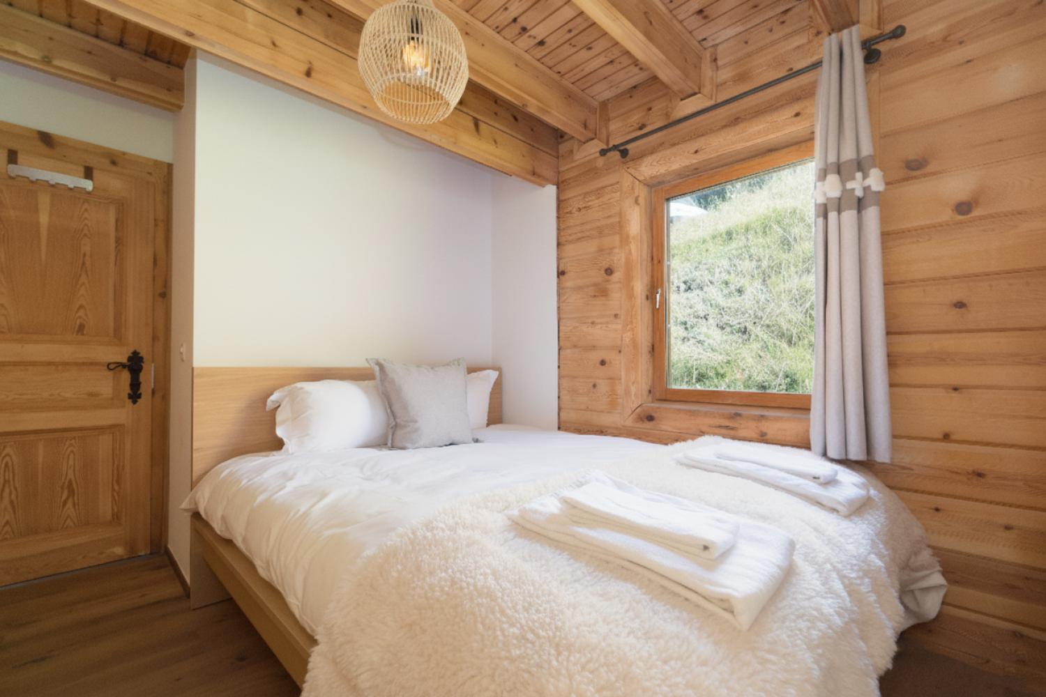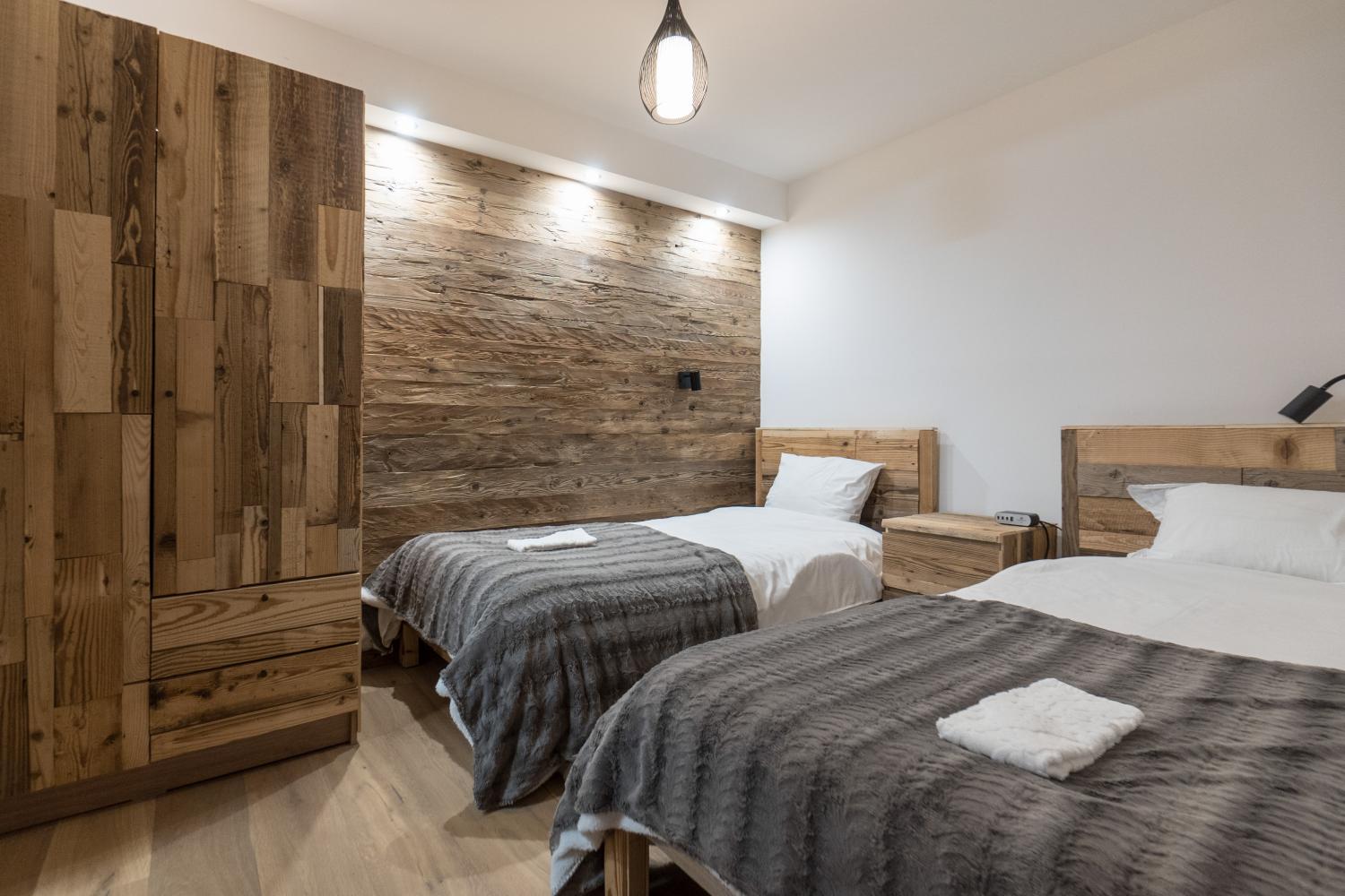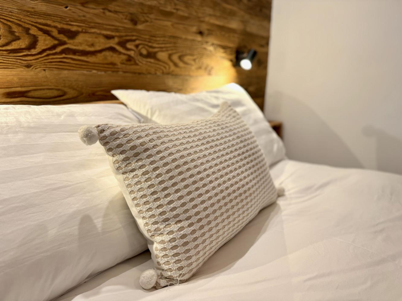 A luxurious master suite with a 180cm double bed, en-suite bathroom, and direct access to a private terrace with stunning alpine views.