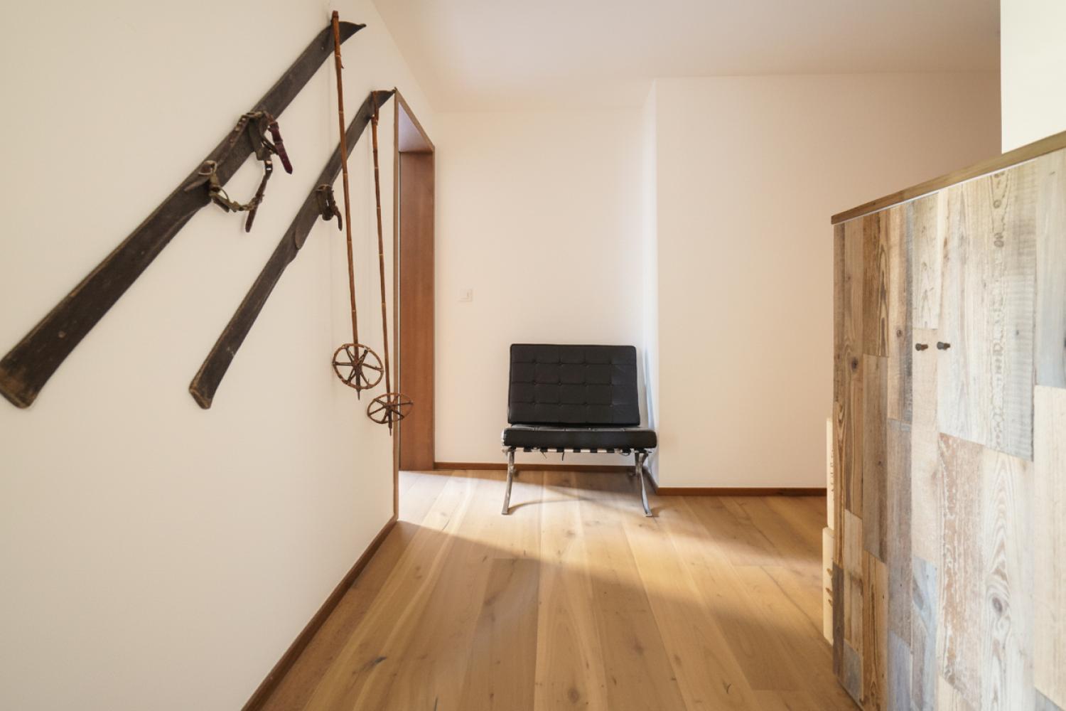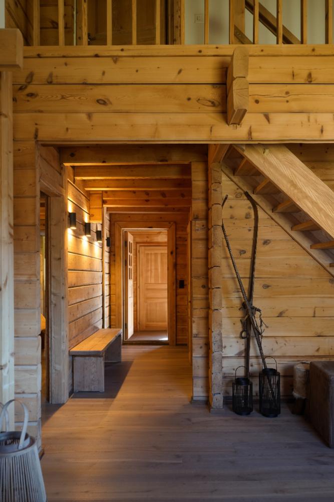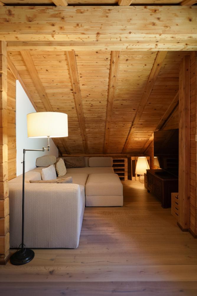 A staircase leads to a mezzanine lounge and TV area, complete with oversized cosy sofas — the perfect spot to unwind after a day on the slopes.
