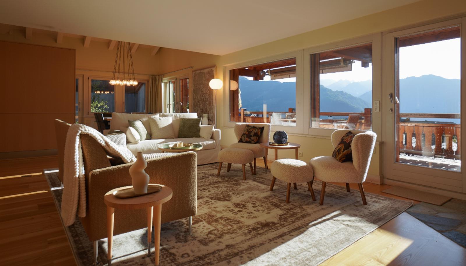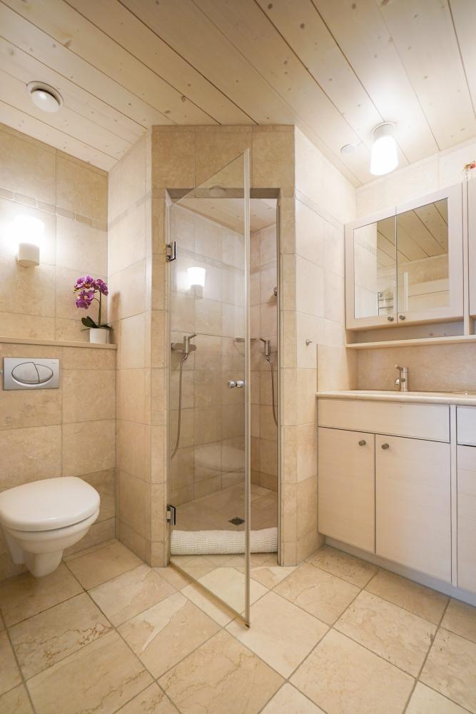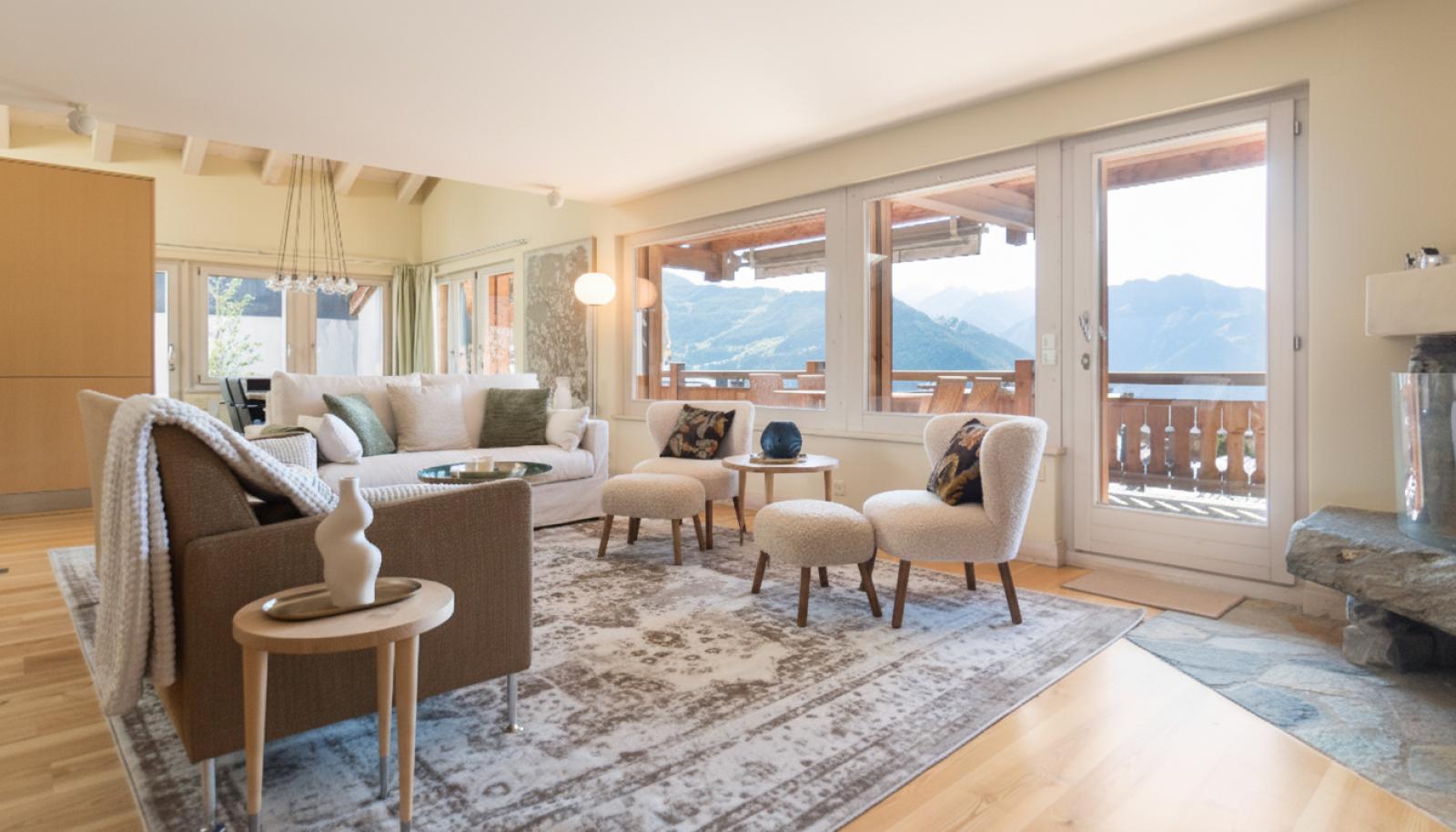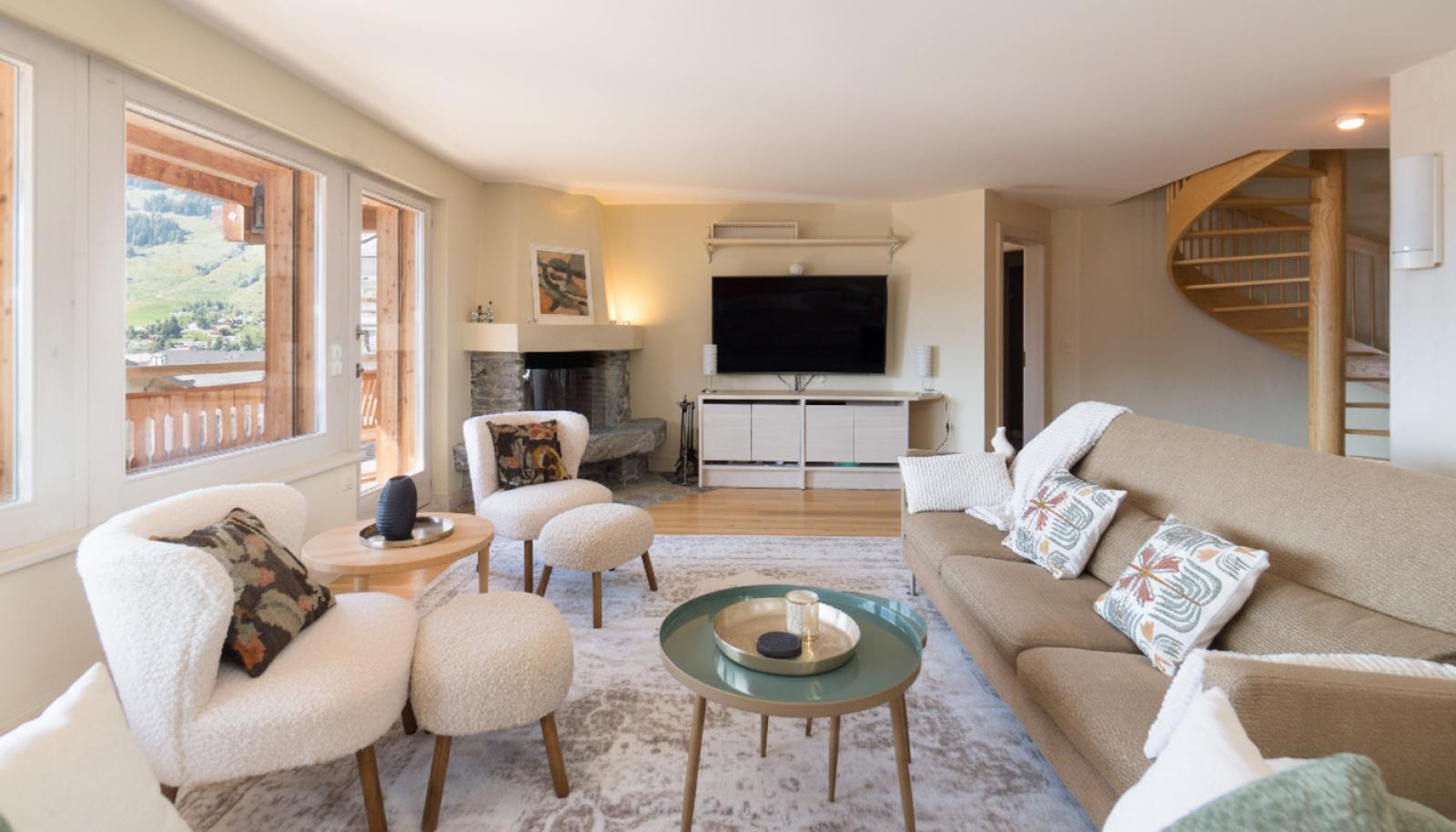 The upstairs floor has another spacious guest double room with its own terrace towards Attelas and Savoleyres, an ensuite shower room, plus the spa area with jacuzzi bath and sauna and a second living room or relaxation area with fireplace and more mountain views.